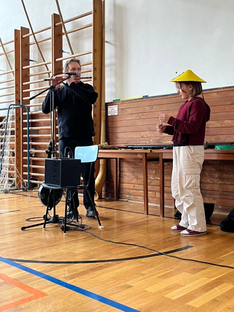 Například zahrál na fujaru ze Slovenska, valašskou koncovku, flétnu z Asie, didgeridoo z Austrálie a mnoho dalších. Nejvíce děti ohromil alpský roh, který měřil několik metrů. Na závěr si všichni zazpívali nebo zahráli na rytmické nástroje.